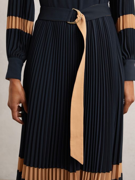 Elegant accordion pleats through the skirt and sleeves bring fluid movement to the Tori dress, crafted from lightweight crepe. Contrasting stripes offer bold definition to the design, echoing the subtle shoulder piping and the reverse of the belt. Accordion pleats. Contrast stripes. Gathered neckline. Button cuffs. D-Ring belt. Concealed zip to reverse. Regular side neck to hem 49.5″ / 126cm.