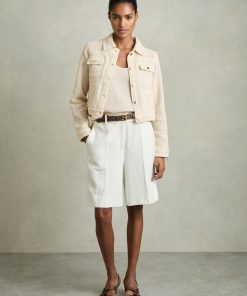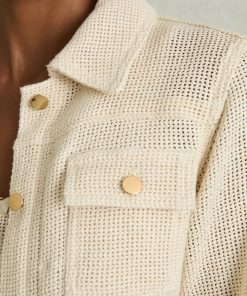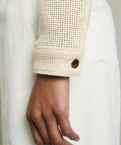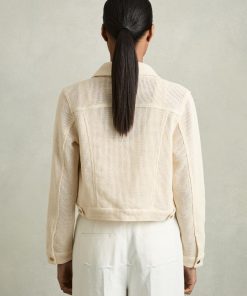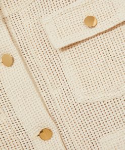 The textured open weave of the Renzo jacket provides a modern twist on the classic trucker silhouette. Gold-tone buttons secure the cuffs, flap pockets, and front placket, accenting with a polished touch. Cotton blend Textured open weave Button flap pockets Cropped Front buttons The model is wearing a size 8. Measurements of model: Height 5ft 10' / 177.8cm. Regular centre back neck to hem 23.5″ / 60cm.