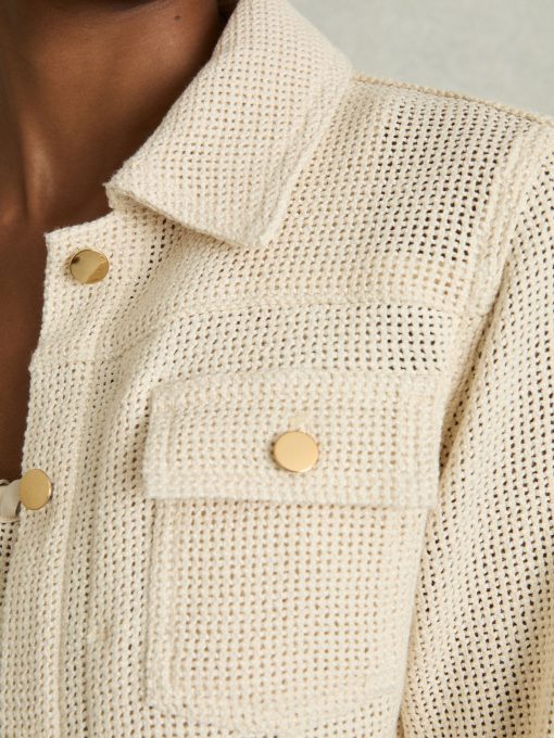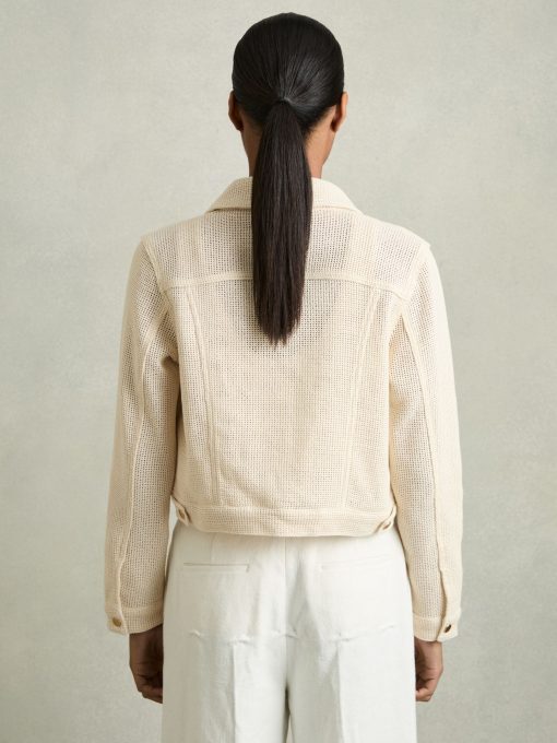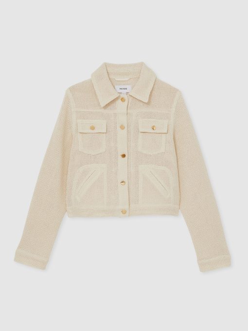 The textured open weave of the Renzo jacket provides a modern twist on the classic trucker silhouette. Gold-tone buttons secure the cuffs, flap pockets, and front placket, accenting with a polished touch. Cotton blend Textured open weave Button flap pockets Cropped Front buttons The model is wearing a size 8. Measurements of model: Height 5ft 10' / 177.8cm. Regular centre back neck to hem 23.5″ / 60cm.