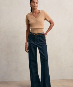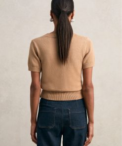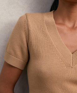 The Camel Valerie top is crafted from a soft cotton-wool blend in a midweight knit, designed with fully-fashioned stitching at the shoulders and neckline for a refined finish. Its classic V-neckline and rib-knit trims add timeless appeal to this versatile piece. Cotton-wool blend Knitted V-Neckline Short sleeves Rib-knit trims The model is wearing a size S. Measurements of model: Height 5ft 10″ / 177.8cm.