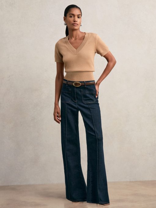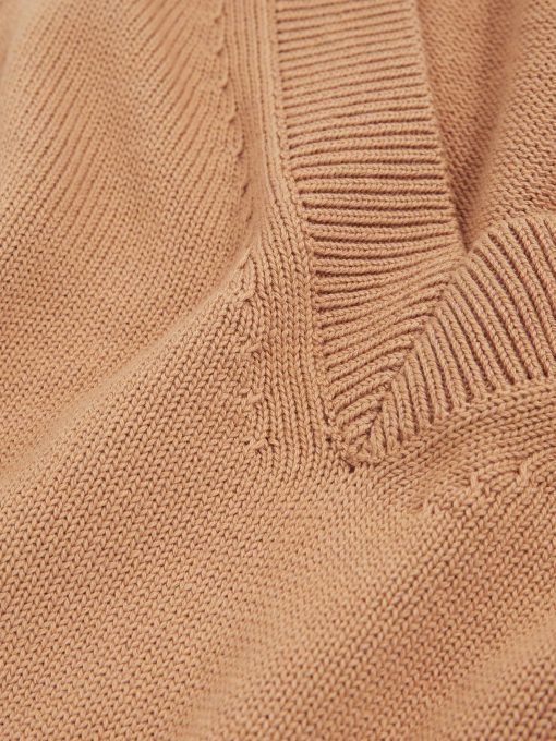 The Camel Valerie top is crafted from a soft cotton-wool blend in a midweight knit, designed with fully-fashioned stitching at the shoulders and neckline for a refined finish. Its classic V-neckline and rib-knit trims add timeless appeal to this versatile piece. Cotton-wool blend Knitted V-Neckline Short sleeves Rib-knit trims The model is wearing a size S. Measurements of model: Height 5ft 10″ / 177.8cm.