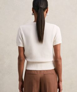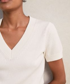 The Ivory Valerie top is crafted from a soft cotton-wool blend in a midweight knit, designed with fully-fashioned stitching at the shoulders and neckline for a refined finish. Its classic V-Neckline and rib-knit trims add timeless appeal to this versatile piece. Cotton-wool blend Knitted V-Neckline Short sleeves Rib-knit trims The model is wearing a size S. Measurements of model: Height 5ft 10' / 177.8cm.