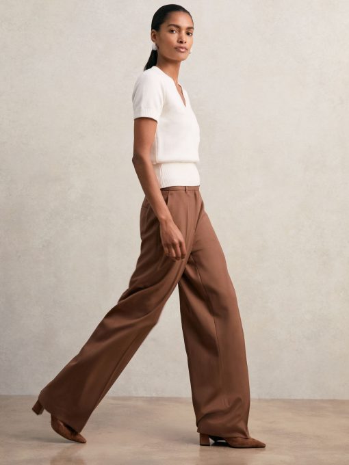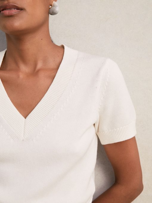 The Ivory Valerie top is crafted from a soft cotton-wool blend in a midweight knit, designed with fully-fashioned stitching at the shoulders and neckline for a refined finish. Its classic V-Neckline and rib-knit trims add timeless appeal to this versatile piece. Cotton-wool blend Knitted V-Neckline Short sleeves Rib-knit trims The model is wearing a size S. Measurements of model: Height 5ft 10' / 177.8cm.