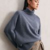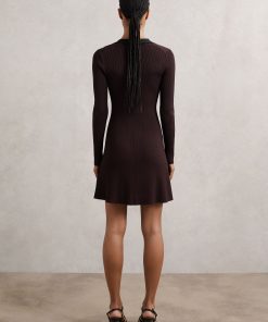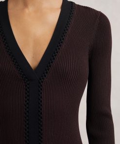 The Alma dress is knitted in a ribbed construction that hugs the body before gently flaring at the hem. Contrasting bands define the silhouette, framed by braided cable stitching for a crafted, tactile finish. A deep V-neckline and long sleeves complete the look with understated elegance. Rib-knit Craft stitching Contrasting bands Deep V-neckline Long sleeves. Regular side neck to hem 34″ / 86cm.