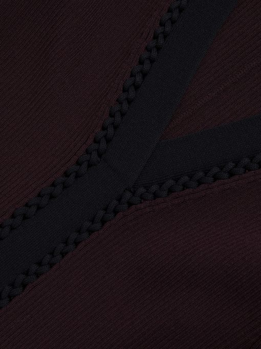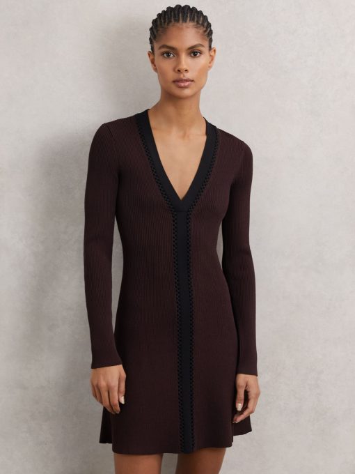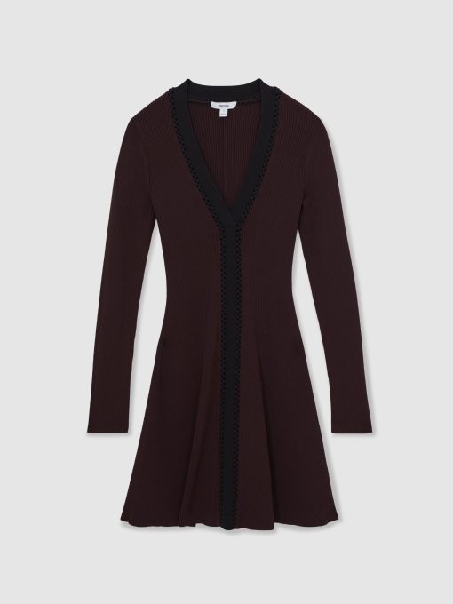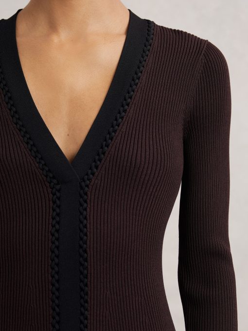 The Alma dress is knitted in a ribbed construction that hugs the body before gently flaring at the hem. Contrasting bands define the silhouette, framed by braided cable stitching for a crafted, tactile finish. A deep V-neckline and long sleeves complete the look with understated elegance. Rib-knit Craft stitching Contrasting bands Deep V-neckline Long sleeves. Regular side neck to hem 34″ / 86cm.