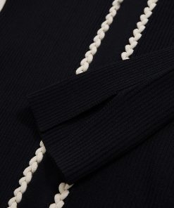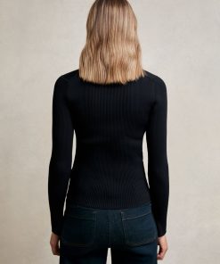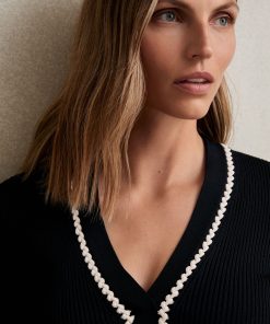 Bold contrast craft stitching frames the deep V-neckline and centre-front, infusing the Lauri top with an artisanal touch. Knitted ribs offer a streamlined, textured finish. Rib knit Craft stitching Deep V-neckline Long sleeves The model is wearing a size S. Measurements of model: 5ft 9.5″ / 177cm.