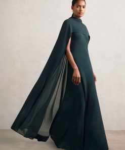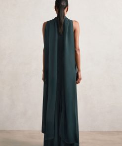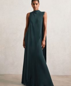 Crafted from elegant crepe, the Teal Green Greta dress is defined by a dramatic split cape cascading down the back, complemented by a detachable chiffon under-layer that adds subtle depth and graceful movement. Rendered in deep teal and cut to a maxi length, it’s perfect for refined occasionwear. Crepe fabrication Draped split cape Detachable chiffon cape layer Sleeveless Concealed zip to reverse The model is wearing a size 8. Measurements of model: Height 5ft 10″ / 177.8cm. Regular side neck to hem 55″ / 140cm.