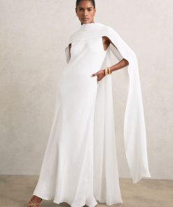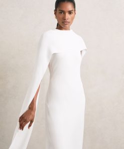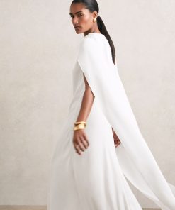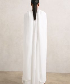 Crafted from elegant crepe, the Greta dress is defined by a dramatic split cape cascading down the back, complemented by a detachable chiffon under-layer that adds subtle depth and graceful movement. Its white hue and maxi length makes it ideal for refined occasionwear or bridal moments. Crepe fabrication Draped split cape Detachable chiffon cape layer Sleeveless Concealed zip to reverse The model is wearing a size 8. Measurements of model: Height 5ft 10″ / 177.8cm. Regular side neck to hem 55″ / 140cm.