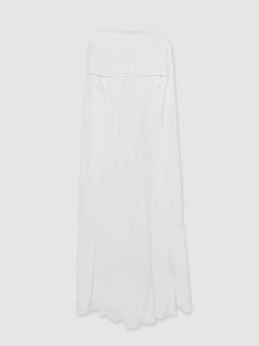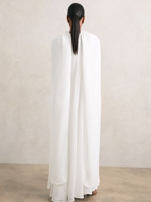 Crafted from elegant crepe, the Greta dress is defined by a dramatic split cape cascading down the back, complemented by a detachable chiffon under-layer that adds subtle depth and graceful movement. Its white hue and maxi length makes it ideal for refined occasionwear or bridal moments. Crepe fabrication Draped split cape Detachable chiffon cape layer Sleeveless Concealed zip to reverse The model is wearing a size 8. Measurements of model: Height 5ft 10″ / 177.8cm. Regular side neck to hem 55″ / 140cm.