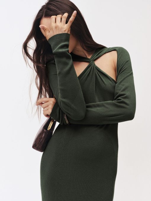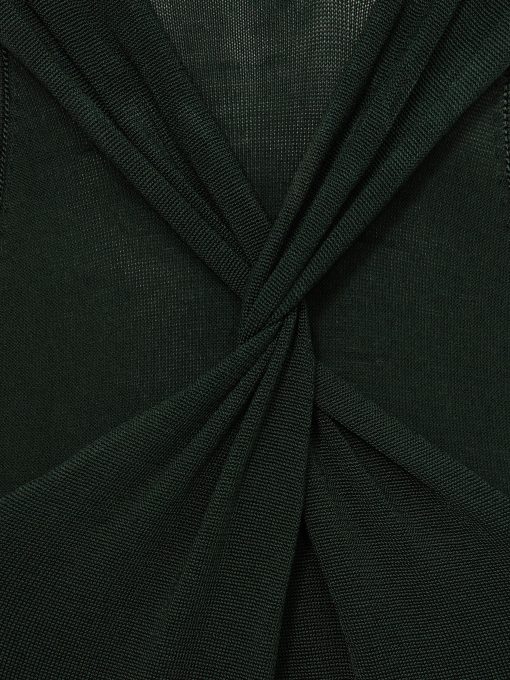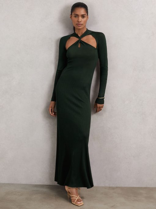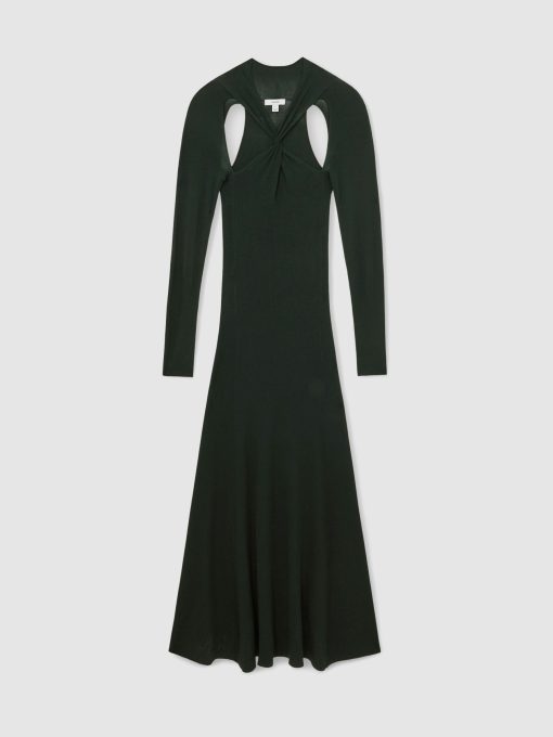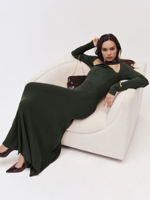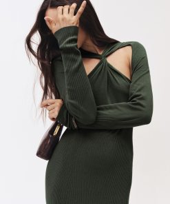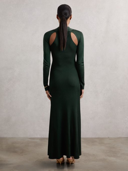 The Dark Green Vivienne dress is defined by bold cut-outs at the chest and back, complemented by a modern twist detail at the neck. Crafted from a compact knit with subtle rib details, its body-skimming fit creates a columnar silhouette that eases towards the hem for effortless movement. Compact knit Ribbed detailing Twist design and cut-outs High neckline Long sleeves Regular side neck to hem 53″ / 135cm.