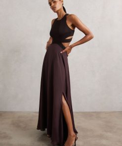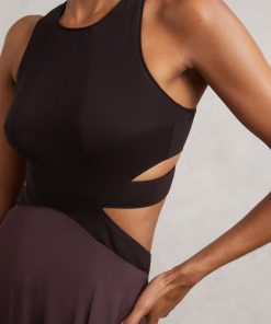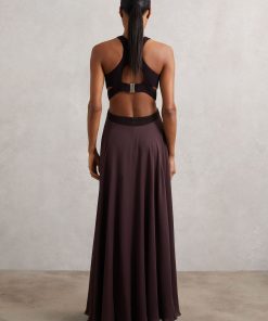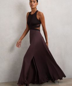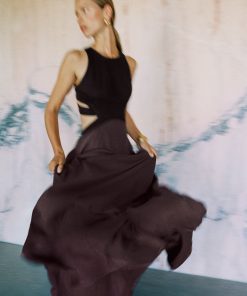 The Paloma dress combines a sleek, cut-out bodice with a flowing full skirt in a contrasting fabrication. A racerback design with a gold-tone clasp adds a modern edge, while a side slit through the skirt brings fluid movement. Hybrid fabrication Cut-outs Racerback Gold-tone clasp to reverse Concealed zip to reverse Regular side neck to hem 60.5″ / 154cm.