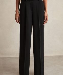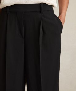 The lightweight twill of the black Eden trousers allows the wide-leg silhouette to drape effortlessly to the floor. An elasticated waistband adds a relaxed touch to the tailored pair. Lightweight twill Wide leg Elasticated back waistband Front pleats Side slip pockets Welt pocket to reverse The model is wearing a size 8. Measurements of model: Height 5ft 10″ / 177.8cm. Regular inside leg length 30.5″ / 78cm.