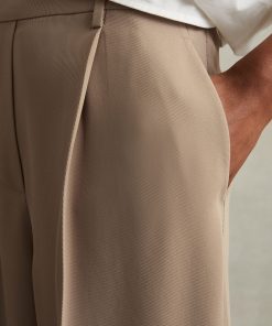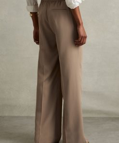 The lightweight twill of the mink neutral Eden trousers allows the wide-leg silhouette to drape effortlessly to the floor. An elasticated waistband adds a relaxed touch to the tailored pair. Lightweight twill Wide leg Elasticated back waistband Front pleats Side slip pockets Welt pocket to reverse The model is wearing a size 8. Measurements of model: Height 5ft 10″ / 177.8cm. Regular inside leg length 30.5″ / 78cm.