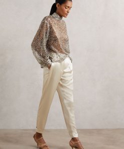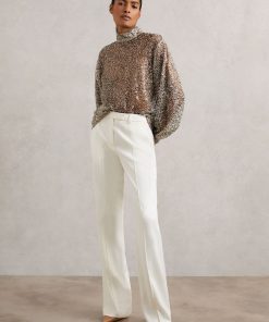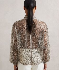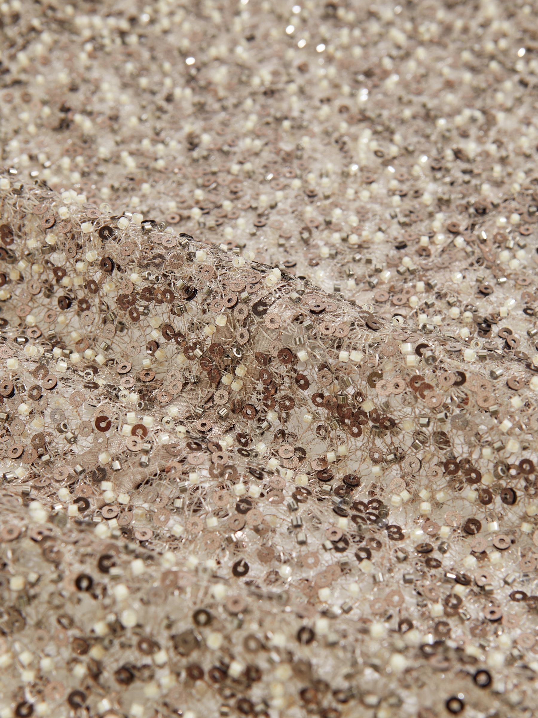 The Sienna top is crafted from a metallicised mesh, richly scattered with shimmering sequins and beads for a standout finish. Fitted cuffs shape the voluminous blouson sleeves, while a high neckline buttons discreetly at the back. Sequin and bead embellishments, High neckline, Blouson sleeves, Button cuffs, Button keyhole to reverse.