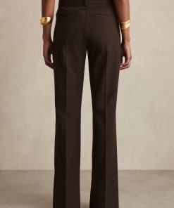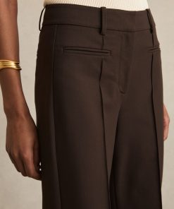A signature high-rise, flared cut is chosen for the chocolate brown Claude trousers. Pinched front seams and pockets refine the look and a high-stretch fabric perfects the fit. High rise Pinched front seams Jetted front pockets Flared leg The model is wearing a size 8. Measurements of model: Height 5ft 10″ / 177.8cm. Regular inside leg length 32″ / 81cm.