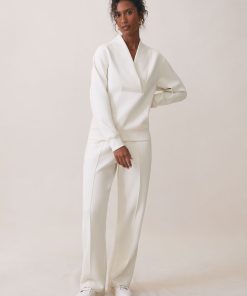The Ivory Annabel sweatshirt is crafted from a heavyweight modal blend with stretch, offering a soft yet structured feel. A deep shawl-style neckline and elasticated trims lend a refined edge to its relaxed, leisurewear-inspired silhouette. Modal blends with stretch Heavyweight knit Shawl-style neckline Drop shoulders Long sleeves