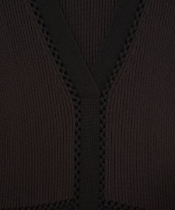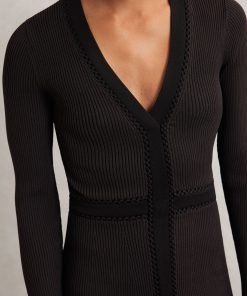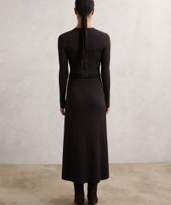 The Laura dress is knitted in a ribbed construction that hugs the body before gently flaring at the hem. Contrasting bands define the silhouette, framed by braided cable stitching for a crafted, tactile finish. A deep V-neckline and long sleeves complete the look with understated elegance. Rib-knit Craft stitching Contrasting bands Deep V-neckline Long sleeves Regular side neck to hem 49″ / 125cm.