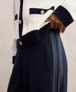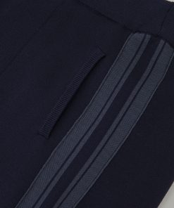 The Navy Samson trousers are knitted with a relaxed, wide-leg silhouette and an elasticated waistband for comfort. Bold contrast stripes run down the side seams, lending a sporty edge to this elevated casual style. Knitted construction Wide leg Contrast side stripes Elasticated waistband Side pockets These trousers have been designed in a more relaxed fit, so please select a size smaller than usual. Regular inside leg length 30″ / 76cm.