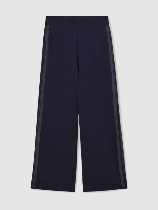 The Navy Samson trousers are knitted with a relaxed, wide-leg silhouette and an elasticated waistband for comfort. Bold contrast stripes run down the side seams, lending a sporty edge to this elevated casual style. Knitted construction Wide leg Contrast side stripes Elasticated waistband Side pockets These trousers have been designed in a more relaxed fit, so please select a size smaller than usual. Regular inside leg length 30″ / 76cm.