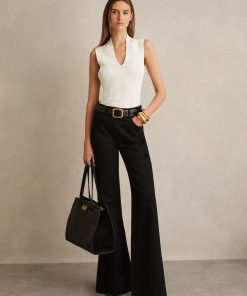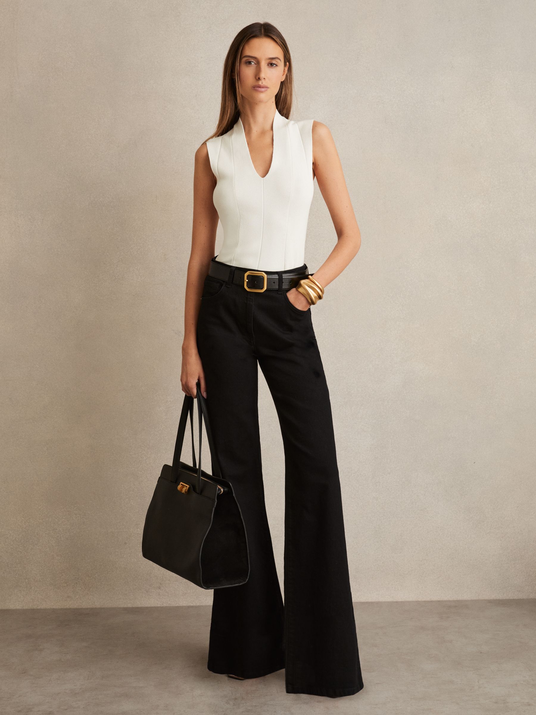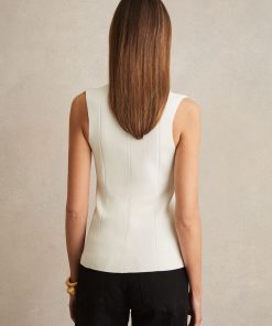 The ivory Kimmy vest is knitted into a panelled construction that smooths over the figure. It’s arranged with a V-neckline that plunges at the front and sits high at the back of the neck. Knitted panelled construction V-neckline Fitted The model is wearing a size S. Measurements of model: Height 5ft 10″ / 178cm.