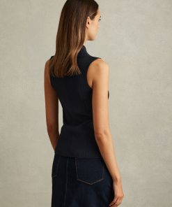 The Navy Kimmy vest is knitted into a panelled construction that smooths over the figure. It’s arranged with a V-neckline that plunges at the front and sits high at the back of the neck. Knitted panelled construction V-neckline Fitted The model is wearing a size S. Measurements of model: 5ft 10″ / 178cm.