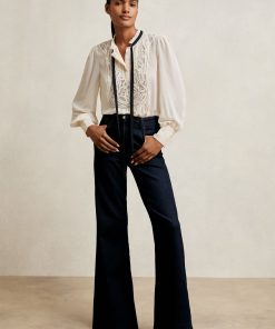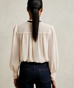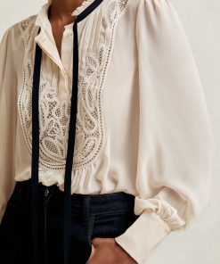 Guipure lace detailing and voluminous blouson sleeves lend the Cream Sara shirt a romantic sensibility. Crafted from airy crepe chiffon, it’s finished with delicate gathers and a contrasting ribbon tie at the pleated neckline. Crepe chiffon Guipure lace Pleated neckline with ribbon tie Blouson sleeves with button cuffs Concealed button placket The model is wearing a size 8. Measurements of model: Height 5ft 10″ / 177.8cm.