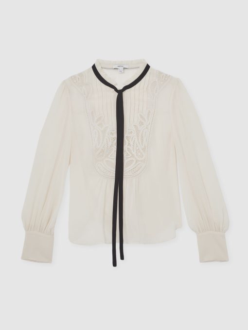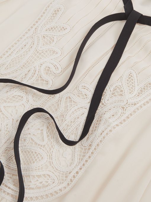 Guipure lace detailing and voluminous blouson sleeves lend the Cream Sara shirt a romantic sensibility. Crafted from airy crepe chiffon, it’s finished with delicate gathers and a contrasting ribbon tie at the pleated neckline. Crepe chiffon Guipure lace Pleated neckline with ribbon tie Blouson sleeves with button cuffs Concealed button placket The model is wearing a size 8. Measurements of model: Height 5ft 10″ / 177.8cm.