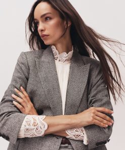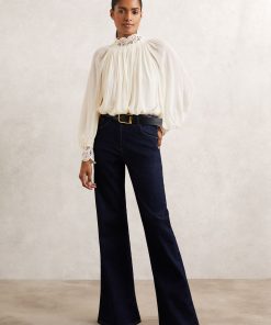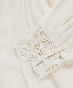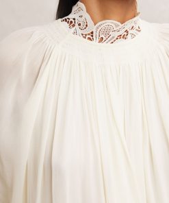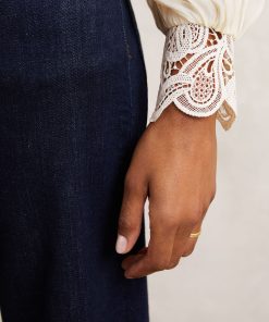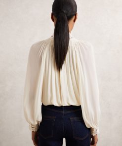 The Cream Czara top is crafted from airy chiffon for graceful movement, while guipure lace trims at the neckline and cuffs lend a romantic edge. A gently shirred neckline and softly blouson sleeves enhance the fluid, feminine shape. Chiffon fabrication Guipure lace trim Shirred neckline Blouson sleeves Buttons to reverse