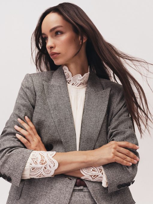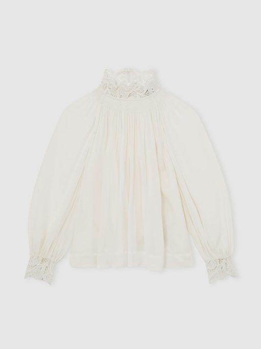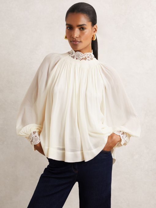 The Cream Czara top is crafted from airy chiffon for graceful movement, while guipure lace trims at the neckline and cuffs lend a romantic edge. A gently shirred neckline and softly blouson sleeves enhance the fluid, feminine shape. Chiffon fabrication Guipure lace trim Shirred neckline Blouson sleeves Buttons to reverse