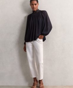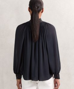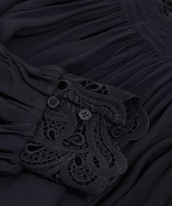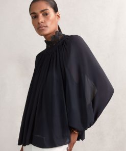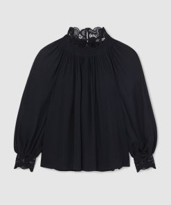 The Czara top is crafted from airy chiffon for graceful movement, while guipure lace trims at the neckline and cuffs lend a romantic edge. A gently shirred neckline and softly blouson sleeves enhance the fluid, feminine shape. Chiffon fabrication. Guipure lace trim. Shirred neckline. Blouson sleeves. Buttons to reverse.