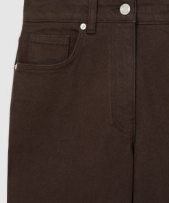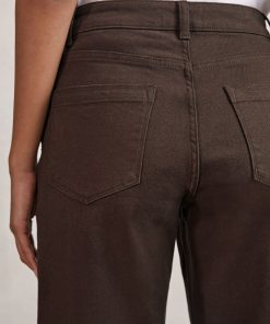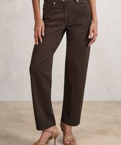 The chocolate Selin jeans are a timeless straight-leg style, designed to elevate your everyday wardrobe. Crafted from soft, stretch-infused denim, they offer a comfortable fit and sit effortlessly at a flattering mid-rise. Straight leg Mid-rise Light feathering at the thigh Five pockets Front button and zip The model is wearing a size 26. Measurements of model: Height 5ft 10' / 178cm. Regular inside leg length 27″ / 69cm.