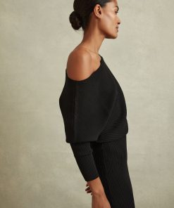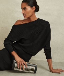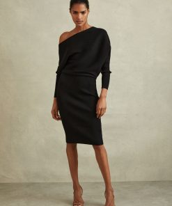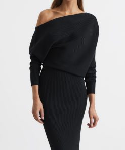 The Lara midi dress in black is arranged in tactile ribs and cut into a draped silhouette, which sits off-the-shoulder. Below the waist and through the sleeves, the dress is fitted against the frame. Style it with heels for a chic look that carries you from day through to night. Knitted construction Ribbed fabrication Off-the-shoulder design Slim-fit sleeves Midi length The model is wearing a size 8. Measurements of model: Height 5ft 10″ / 177.8cm. Regular side neck to hem 43″ / 109cm.