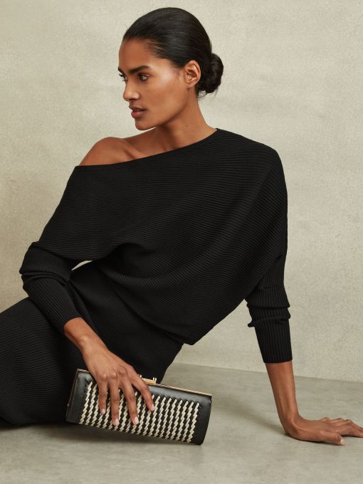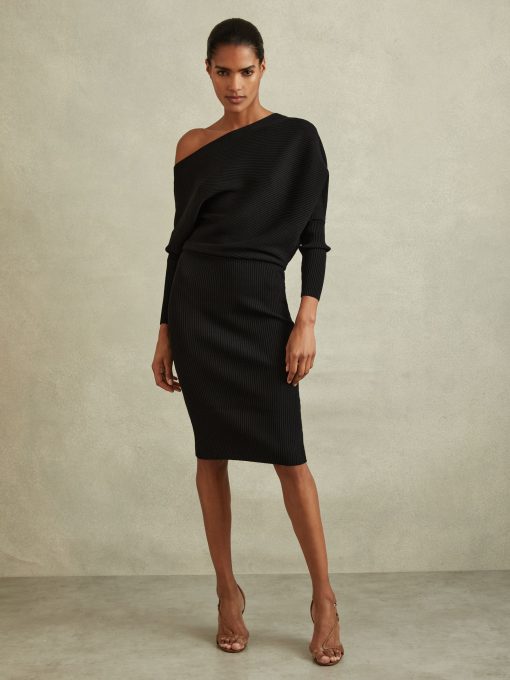 The Lara midi dress in black is arranged in tactile ribs and cut into a draped silhouette, which sits off-the-shoulder. Below the waist and through the sleeves, the dress is fitted against the frame. Style it with heels for a chic look that carries you from day through to night. Knitted construction Ribbed fabrication Off-the-shoulder design Slim-fit sleeves Midi length The model is wearing a size 8. Measurements of model: Height 5ft 10″ / 177.8cm. Regular side neck to hem 43″ / 109cm.