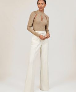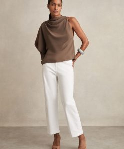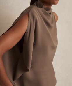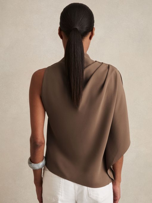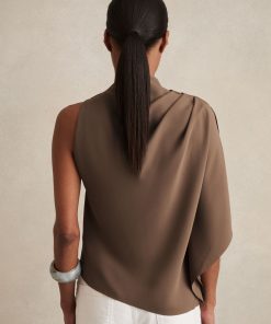 The Mink Elle top is elegantly draped to an asymmetric silhouette. A single split sleeve creates a fluid, dynamic shape, while the high neckline adds a refined touch. Asymmetric silhouette Single split sleeve Draping High neckline The model is wearing a size 8. Measurements of model: Height 5ft 10″ / 177.8cm.