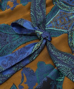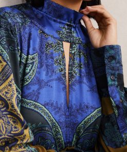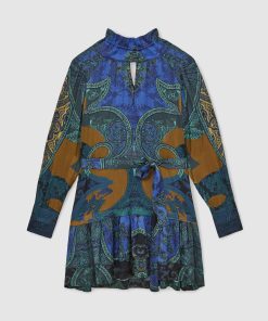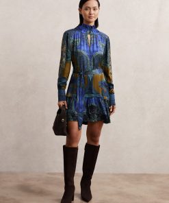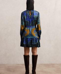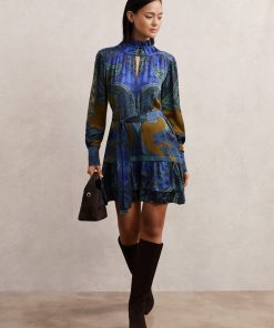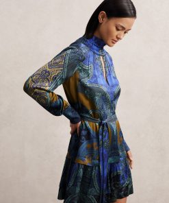 The Kaisley dress is patterned with a vibrant paisley print that enlivens its flippy mini silhouette. A drawstring-tied high neckline and blouson sleeves add soft volume, while a self-tie belt cinches the waist for definition. Paisley print. High neckline with tied back. Keyhole detail. Self-tie belt. The model is wearing a size 8. Measurements of model: Height 5ft 9″ / 175cm. Regular side neck to hem 34.5″ / 87cm.