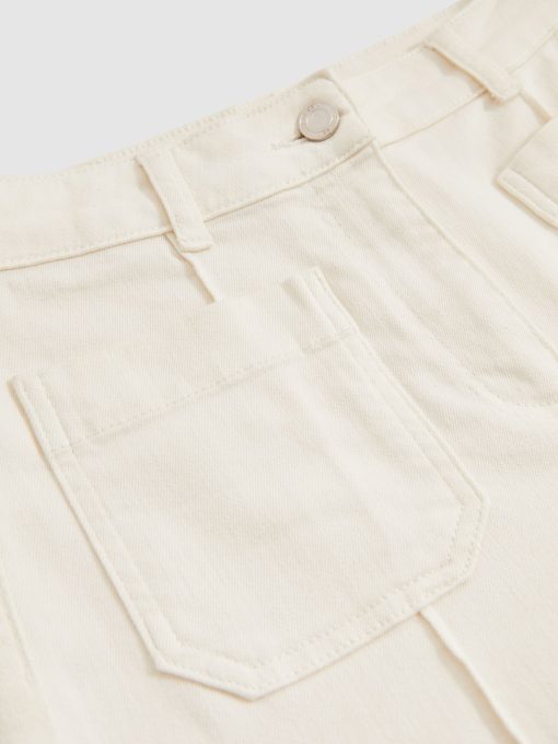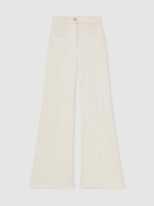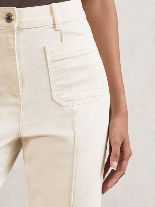 The Ecru Sakura jeans are cut with a modern flared leg, defined by front patch pockets and elongating pintucks that run from waist to hem. A high-rise waist further enhances the lengthened silhouette. Cotton-blend denim Flared high-rise Pintucks Patch pockets Front button and zip The model is wearing a size 26. Measurements of model: Height 5ft 10″ / 177.8cm. Regular inside leg length 32″ / 81cm.