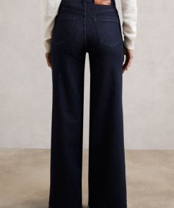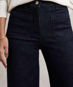 A modern take on vintage denim, the Dark Blue Bella jeans are crafted from soft stretch cotton-modal. Their high-rise waist and wide-leg silhouette channel a subtle ’70s mood, with front patch pockets adding structure and charm. Cotton-modal denim with stretch Wide leg High rise Front patch pockets Front button and zip The model is wearing a size 26. Measurements of model: Height 5ft 9' / 175cm. Regular inside leg length 32″ / 81cm.