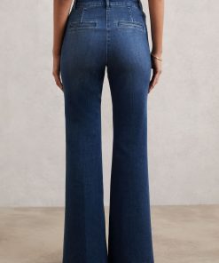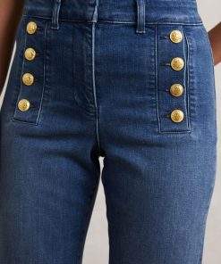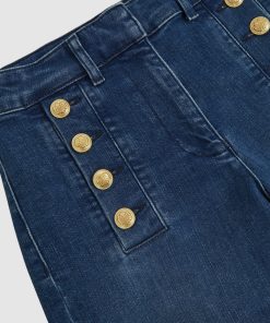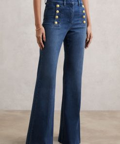 The Athena jeans hug the hips with a flattering high-rise fit and flare elegantly from the knee. Crest-embossed buttons at the front add a nautical-inspired touch to the design. Flared High rise. Button detailing. Hook-and-bar with zip. Petite inside leg length 30″ / 76cm.
