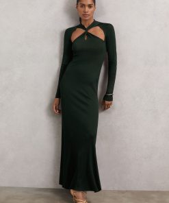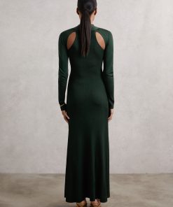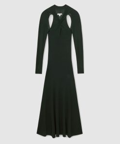 The Vivienne dress is defined by bold cut-outs at the chest and back, complemented by a modern twist detail at the neck. Crafted from a compact knit with subtle rib details, its body-skimming fit creates a columnar silhouette that eases towards the hem for effortless movement. Compact knit Ribbed detailing Twist design and cut-outs High neckline Long sleeves Petite side neck to hem 48.5″ / 123cm.