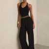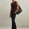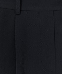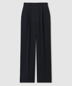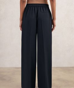 The lightweight twill of the navy Eden trousers allows the wide-leg silhouette to drape effortlessly to the floor. An elasticated waistband adds a relaxed touch to the tailored pair. Lightweight twill Wide leg Elasticated back waistband Front pleats Side slip pockets Welt pocket to reverse The model is wearing a size 8. Measurements of model: Height 5ft 10″ / 177.8cm. Petite inside leg length 28.5″ / 73cm.