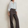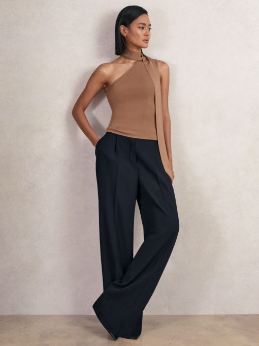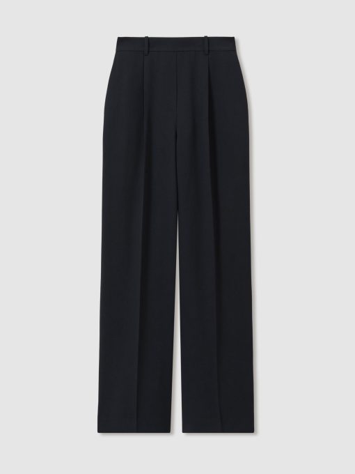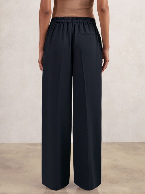 The lightweight twill of the navy Eden trousers allows the wide-leg silhouette to drape effortlessly to the floor. An elasticated waistband adds a relaxed touch to the tailored pair. Lightweight twill Wide leg Elasticated back waistband Front pleats Side slip pockets Welt pocket to reverse The model is wearing a size 8. Measurements of model: Height 5ft 10″ / 177.8cm. Petite inside leg length 28.5″ / 73cm.