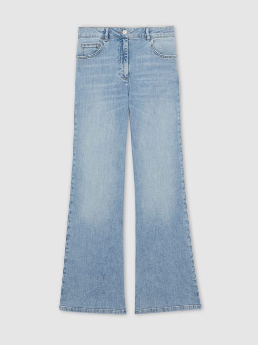 The Light Blue Bonnie jeans are a modern take on classic denim, featuring a flattering mid-rise and a chic flared silhouette. With five-pocket styling and a front button and zip closure, they offer both timeless appeal and effortless wearability, perfect for elevating everyday looks. Denim Flared Mid rise Five pockets Front button and zip Belt not included The model is wearing a size 26. Measurements of model: Height 5ft 10″ / 177.8cm. Petite inside leg length 32″ / 81cm.