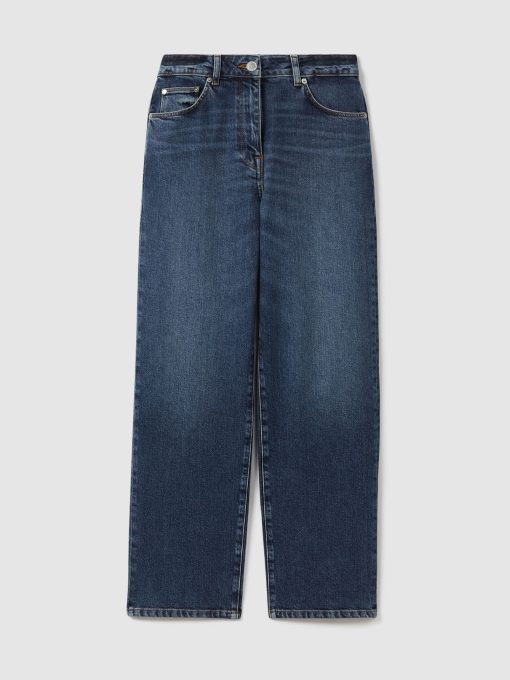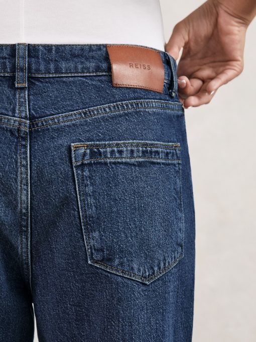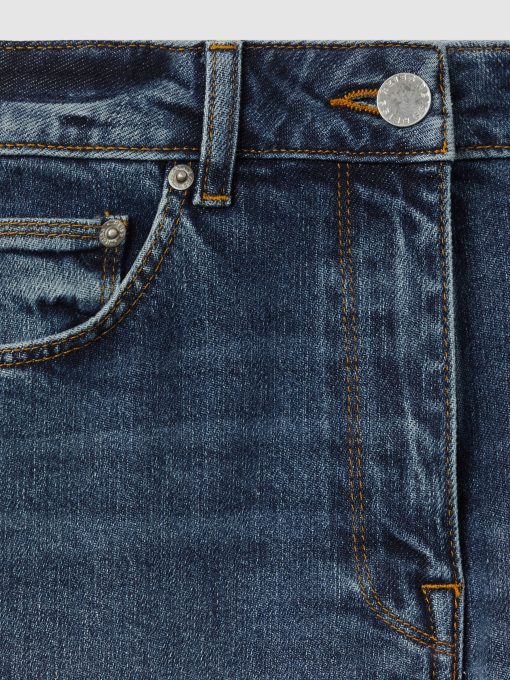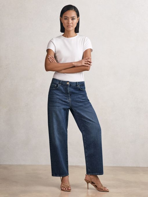 The Mid Blue Selin jeans are a timeless straight-leg style, designed to elevate your everyday wardrobe. Cut from soft, stretch-infused denim, they sit at a flattering mid-rise and fall to a slightly cropped length for a modern finish. Straight leg Mid rise Light feathering at the thigh Five pockets Front button and zip The model is wearing a size 26. Measurements of model: 5ft 9.5″ / 176.5cm. Petite inside leg length 27″ / 69cm.