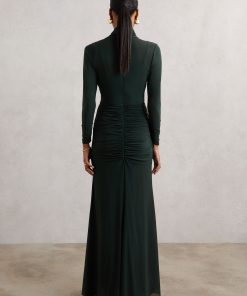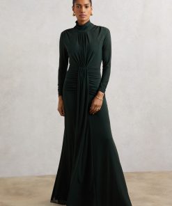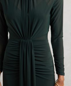 Danni is a figure-skimming maxi dress, crafted from semi-sheer fabric and defined by artful ruching through the front, back and sleeves. A softly draped sash extends from the waist, while a gentle flare towards the hem adds fluidity to its elegant silhouette.RuchingDraped front sashHigh necklineLong sleevesConcealed zip to reverse The model is wearing a size 8 Measurements of model: 5ft9 / 175cm Petite side neck to hem 58.5″ / 148cm.
