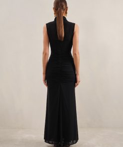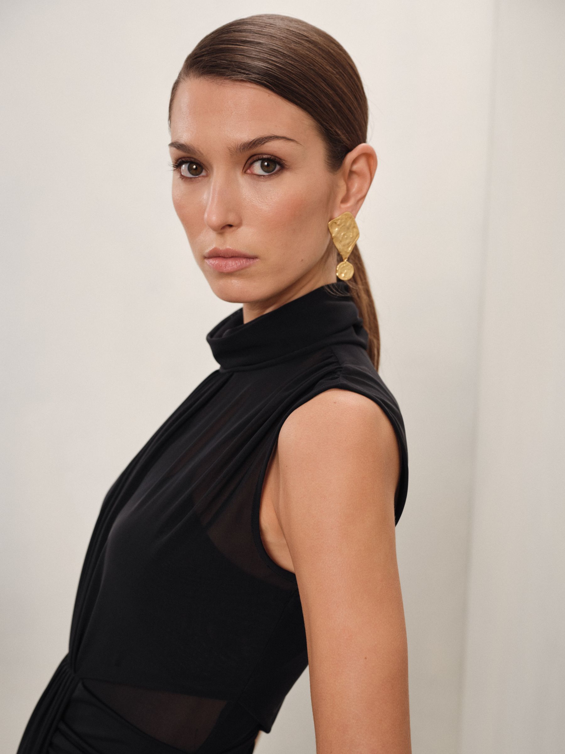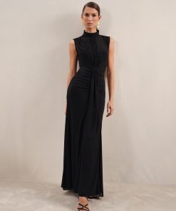 A high neck, flared floor-length hem and central ruching give the Daniella dress a modern, statuesque look. Sheer detailing at the bodice offers a discreet hint of skin, exuding understated allure. High neckline Ruching Pleat details Concealed zip to reverse The model is wearing a size 8 Measurements of model: 5ft9.5 / 176cm Petite side neck to hem 53.5″ / 136cm.