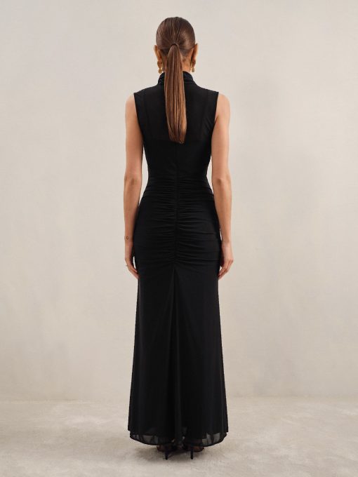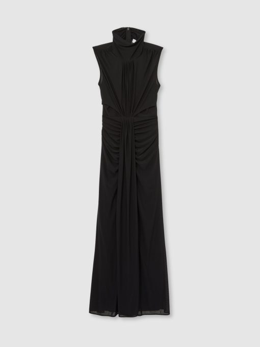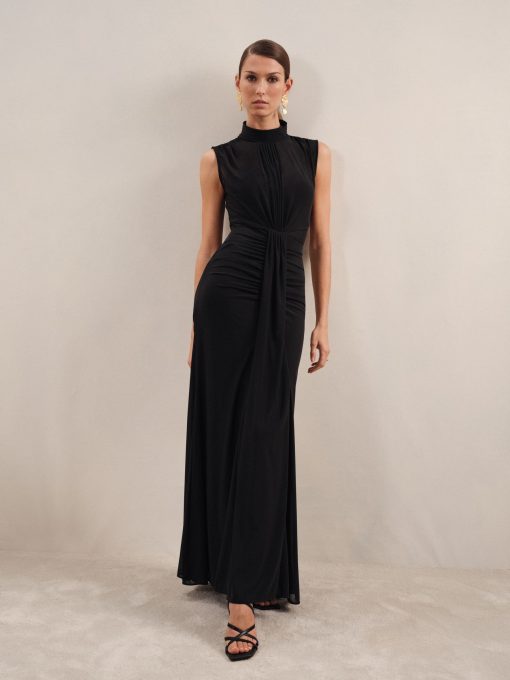 A high neck, flared floor-length hem and central ruching give the Daniella dress a modern, statuesque look. Sheer detailing at the bodice offers a discreet hint of skin, exuding understated allure. High neckline Ruching Pleat details Concealed zip to reverse The model is wearing a size 8 Measurements of model: 5ft9.5 / 176cm Petite side neck to hem 53.5″ / 136cm.