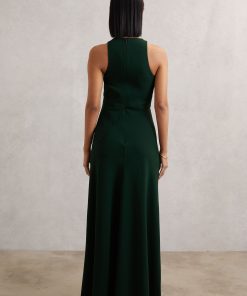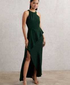 The Gabriella dress will have you event-ready in an instant with its high neckline and fluid silhouette. It has a sleeveless bodice detailed with pleats, a slanted softly draped peplum and a high slit for an alluring finish. High pleated neckline Sleeveless Asymmetric peplum Slashed hemline Concealed zip to reverse Petite side neck to hem 53″ / 134cm.