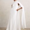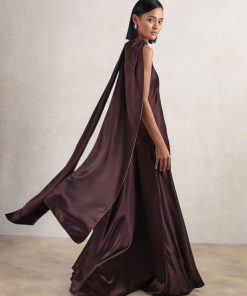 The Fae dress exudes occasion-ready elegance in emerald green satin. A draped cowl neckline and fluid cape-style design create a beautifully flowing silhouette, enhanced by the fabric’s lustrous sheen for a refined, effortless statement. Satin Cape style Sleeveless Concealed zip The model is wearing a size 8. Measurements of model: Height 5ft 9″ / 175cm. Petite side neck to hem 56.5″ / 143cm.