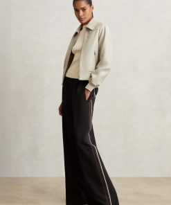 Crafted from jersey twill, the Robyn trousers blend relaxed tailoring with a sporty edge. The wide-leg silhouette is accented by dynamic side stripes, while an elasticated waistband ensures effortless comfort. Front pintucks add a touch of structure, balancing ease with refinement. Jersey twill Wide leg Side stripes Elasticated waistband Front pintucks The model is wearing a size 8. Measurements of model: Height 5ft 10″ / 178cm. Petite inside leg length 28″ / 71cm.