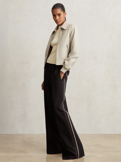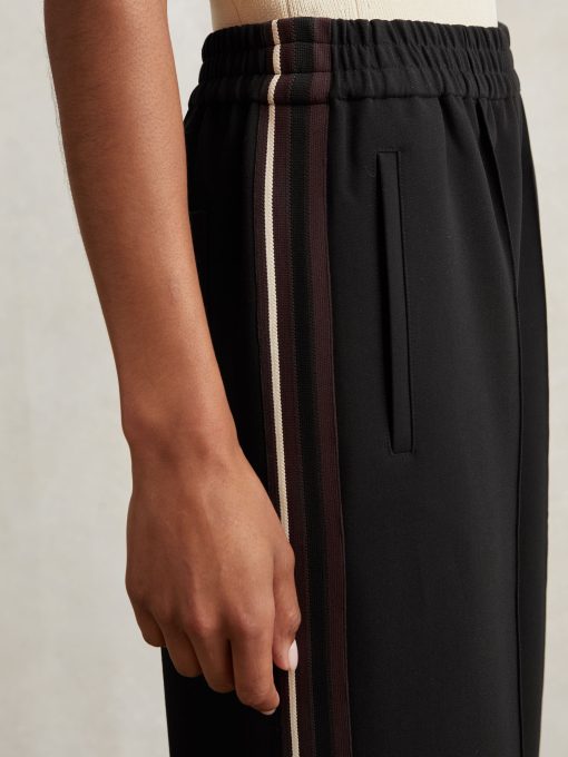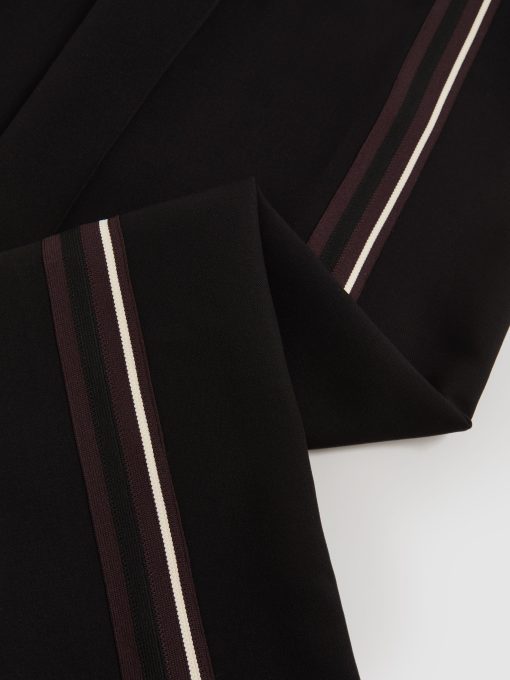Crafted from jersey twill, the Robyn trousers blend relaxed tailoring with a sporty edge. The wide-leg silhouette is accented by dynamic side stripes, while an elasticated waistband ensures effortless comfort. Front pintucks add a touch of structure, balancing ease with refinement. Jersey twill Wide leg Side stripes Elasticated waistband Front pintucks The model is wearing a size 8. Measurements of model: Height 5ft 10″ / 178cm. Petite inside leg length 28″ / 71cm.